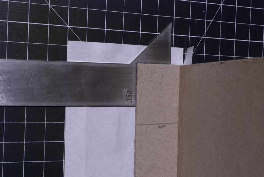 This a tool for mitering the upper front corners of clamshell-box trays. The diagonal edge creates a flap to cover the front edge of a tray wall, and the straight edge creates a flap that folds down to the cover the inside. The dimension on the tool is .030” over the suggested board thickness. These come in a wide range — .110” (2.8mm), .130” (3.3mm), .150” (3.8mm), .200” (5mm), .240” (6mm), .280”(7mm) — to accommodate double walled boxes. The cutting length is 5". This cut was first shown to me by John DeMerritt. Laser-cut stainless steel.