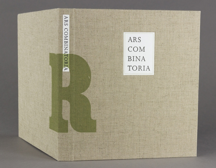 Ars Combinatoria is an exploration of the graphic possibilities of a single piece of wood type—a thirty pica Clarendon R—and a restricted set of operations—positive and negative auto-pressure printing with only one inked impression. This technique enables the top of the wood type to interact with the bottom and itself. With æsthetic and technical constraints there are eighteen prints, twelve of which are displayed here. The suite of prints comes in an elegant box with a small booklet—printed with laser printing, letterpress, and three-color offset lithography—explaining the process. An edition of 30.